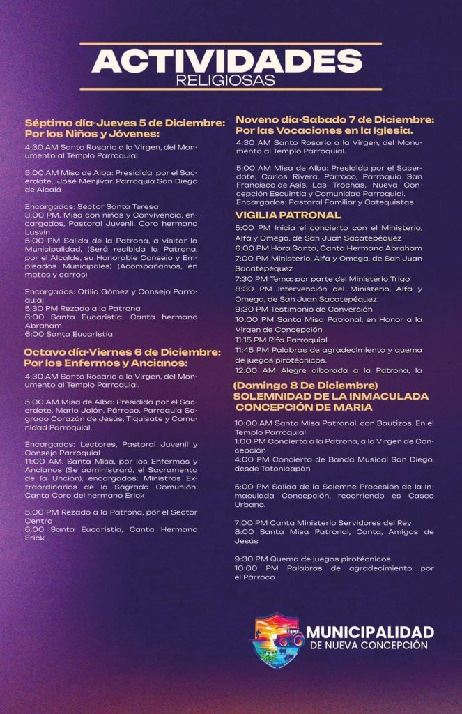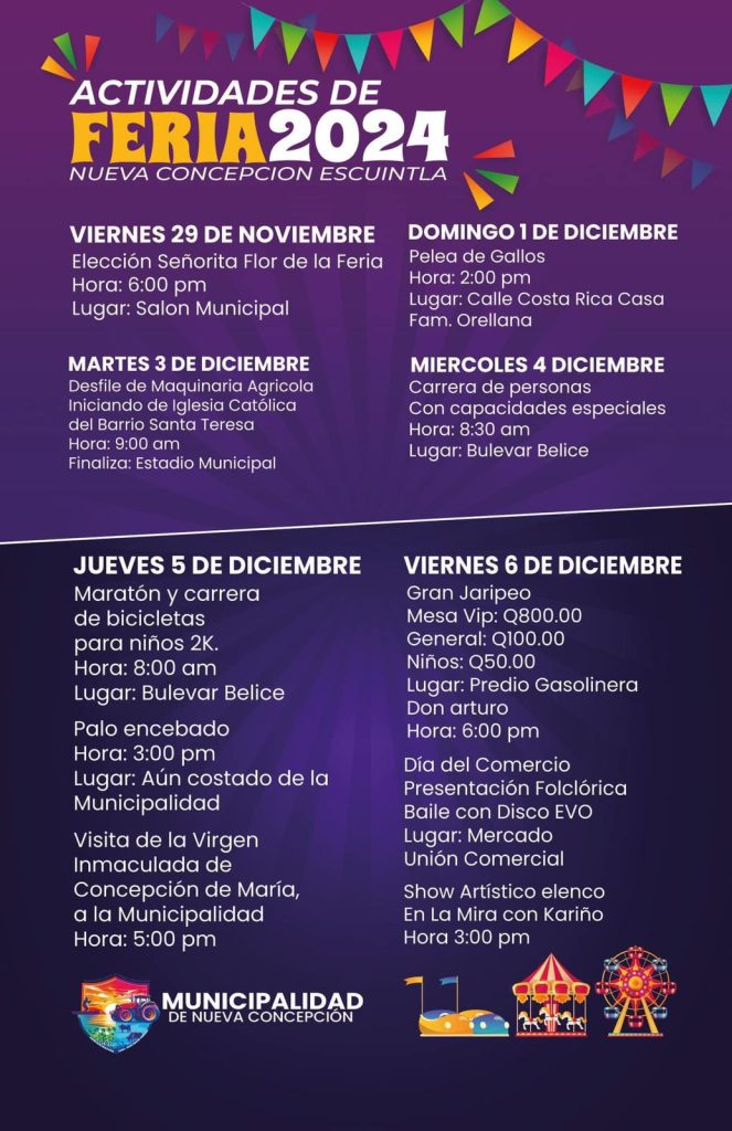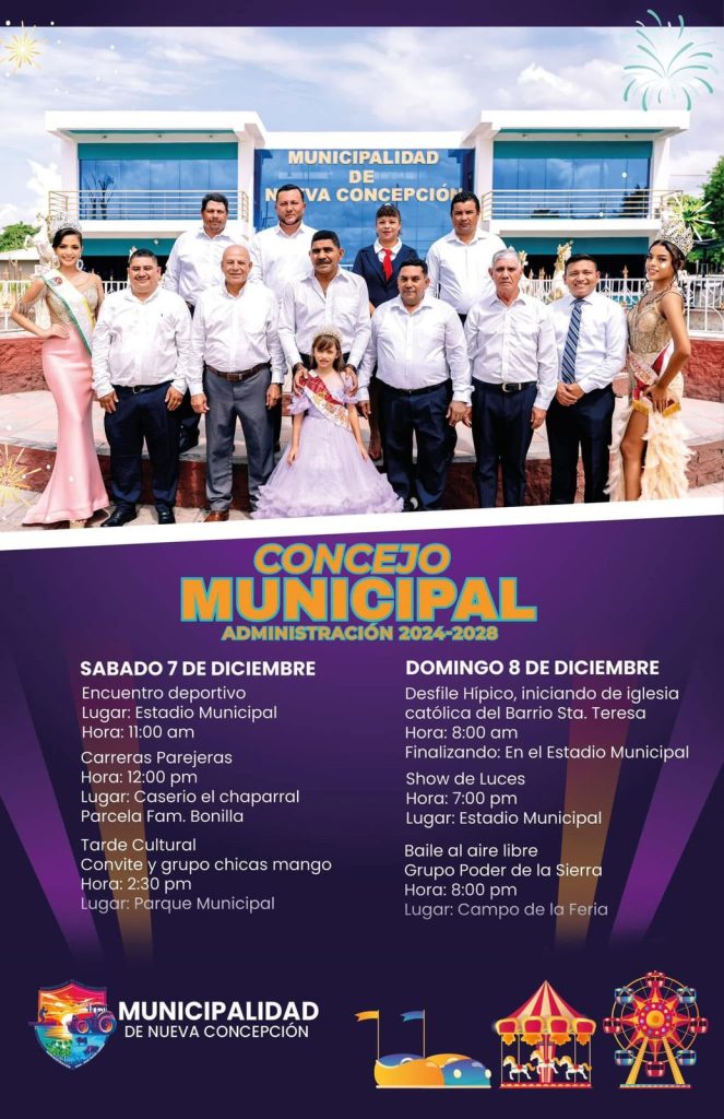 La Municipalidad de Nueva Concepción da a conocer a la población en general el programa de Feria 2024 en Honor a la Inmaculada Virgen de Concepción, esperamos que asistan y disfruten de las actividades que se tienen programadas.