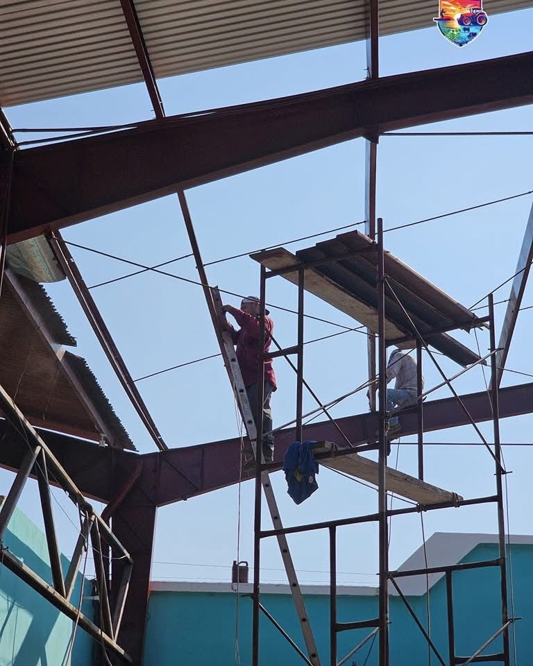 Se continúa con los trabajos de remozamiento del techo en el Gimnasio Municipal, proyecto que busca mejorar las instalaciones para beneficio de todos los vecinos. El señor alcalde Isaías Corado supervisó personalmente el avance de estas labores, reafirmando su compromiso con el desarrollo de infraestructura en el municipio.