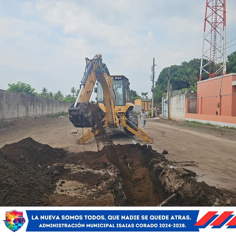 La maquinaria de la Municipalidad de Nueva Concepción realiza trabajos de drenaje en lo que será el bulevar de la calle del Banco, donde se llevarán a cabo 200 metros de instalación de drenaje, como parte del proyecto de desarrollo vial para beneficio de la comunidad.
