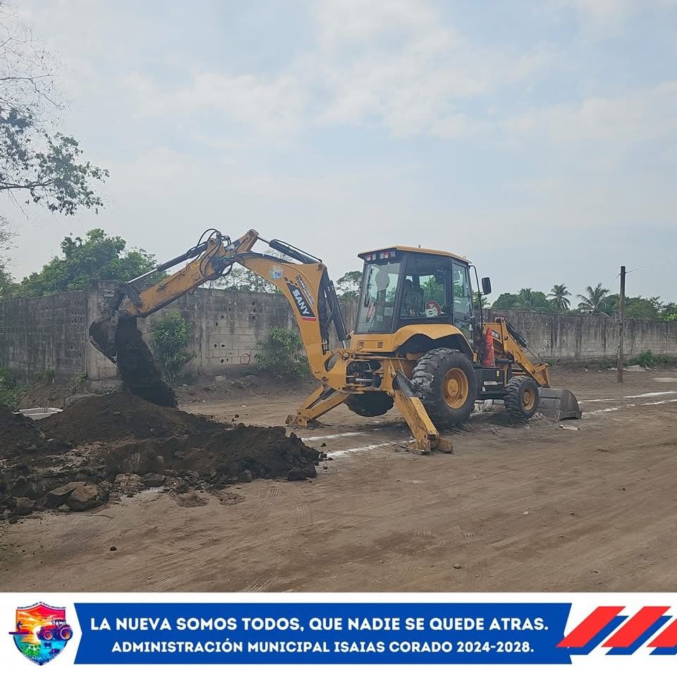 La maquinaria de la Municipalidad de Nueva Concepción realiza trabajos de drenaje en lo que será el bulevar de la calle del Banco, donde se llevarán a cabo 200 metros de instalación de drenaje, como parte del proyecto de desarrollo vial para beneficio de la comunidad.